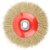 Корщетка-насадка для УШМ КУРС типа ‘’колесо’’ предназначена для обработки дерева и металла, снятия краски. Волнистая проволока обеспечивает деликатную зачистку поверхностей. Латунное покрытие проволоки предотвращают коррозию. Гайка с резьбой М14 обеспечивает прочную фиксацию на УШМ.