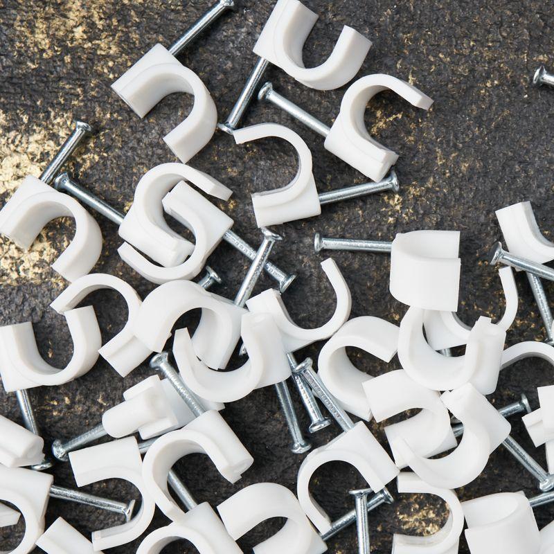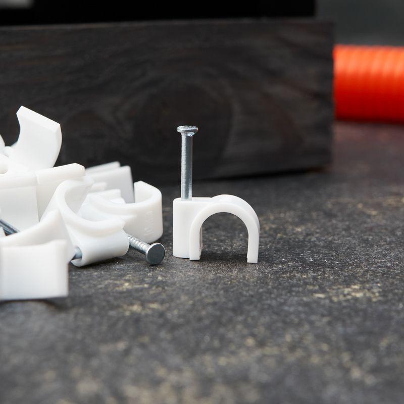 Круглый крепеж 10 мм с гвоздем предназначен для фиксации круглого кабеля к деревянной поверхности. Такой крепеж будет особенно полезен для использования на даче или в частном деревянном доме. Представляет собой дугообразную скобу белого цвета, выполненную из качественного пластика, с гвоздем в специальном отверстии. Скоба используется для мгновенного и надежного крепления проводов и кабелей к поверхностям стен, несущих конструкций и потолков. Гвоздь выполнен из закаленной стали, что позволяет закрепить его даже в плотной и твердой древесине без риска погнуть или сломать.