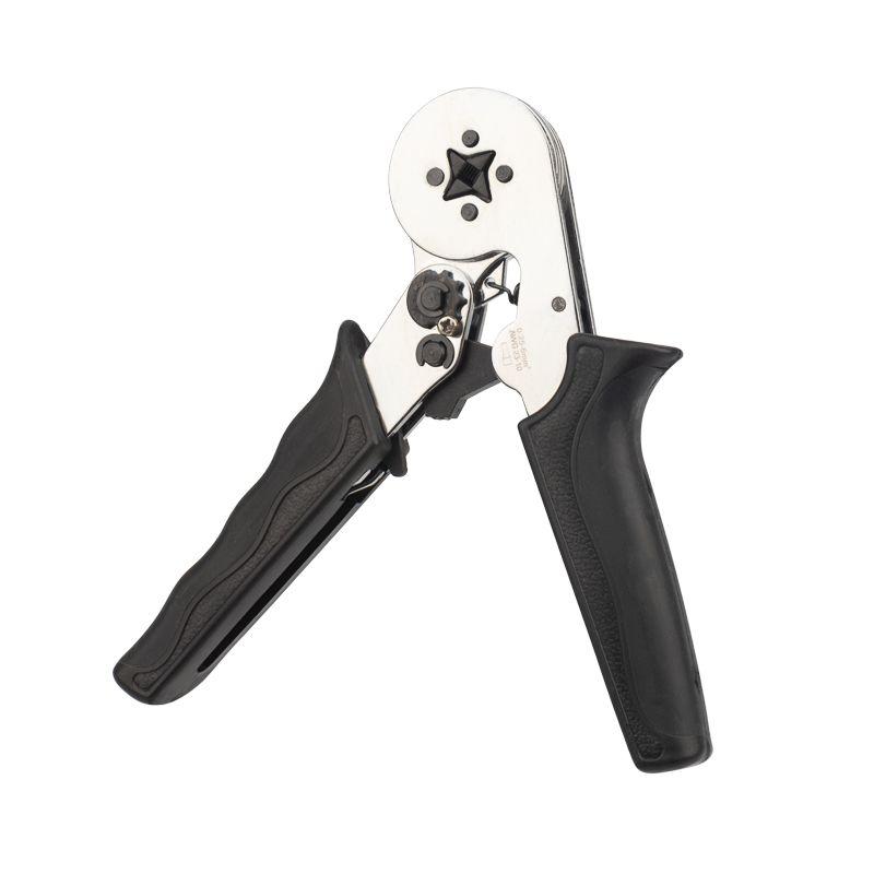Кримпер HT-864 предназначен для опрессовки штыревых наконечников сечением 0,25–6 мм2. Корпус кримпера изготовлен из высокопрочной закаленной инструментальной стали с хромированием, что обеспечивает длительный срок службы и устойчивость к механическим нагрузкам. Четырехсегментная саморегулирующаяся матрица с системой поворотных кулачков диафрагменного типа выполняет квадратный профиль обжима с рифлением, обеспечивая равномерное распределение силы обжима. Регулятор давления позволяет настроить оптимальное усилие обжима для разных типов клемм. Возвратный механизм автоматически возвращает ручки в исходное положение после каждого цикла обжима. Храповой механизм обеспечивает качественную опрессовку без преждевременного разжатия ручек. Нескользящие рукоятки выполнены из плотного синтетического материала, что делает работу комфортной и безопасной даже при длительном использовании.