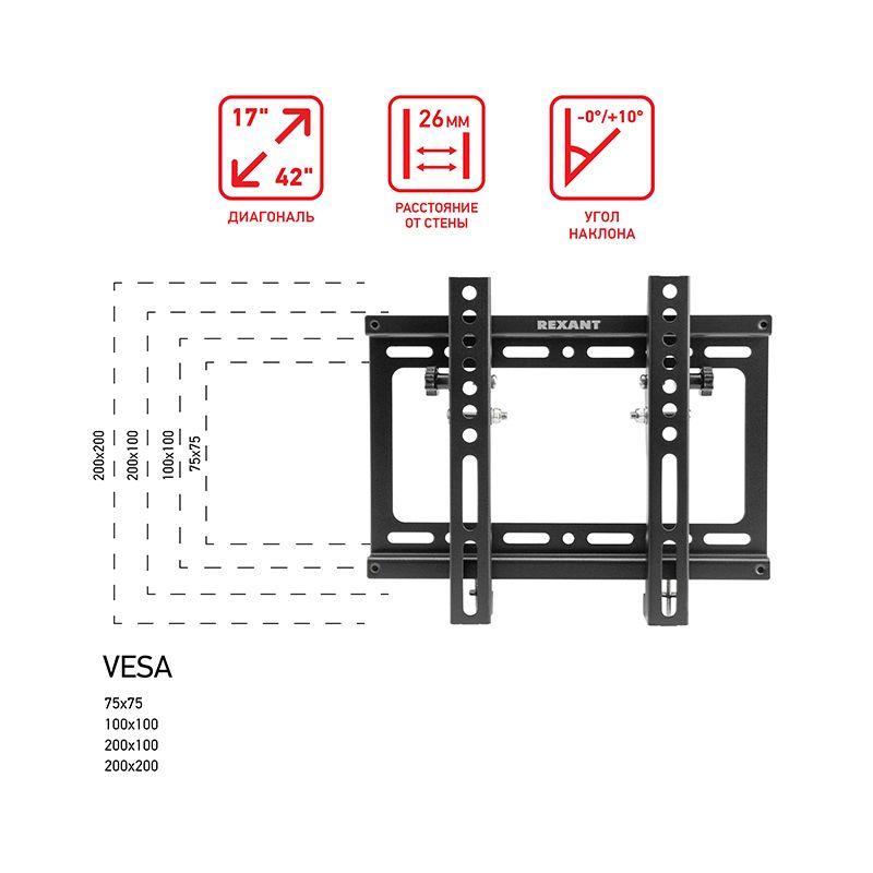 Настенный кронштейн – оптимальное приспособление для современного дома и офиса. Продуманная конструкция кронштейна предназначена для крепления на стену телевизор с диагональю 13"-43" дюймов. Благодаря возможности наклона кронштейна просмотр телевизора будет комфортным из любой точки помещения. Положение техники можно настроить таким образом, что изображение не будет «бликовать» при смене освещения. Механизм позволяет менять направление экрана без усилий и сохраняет заданное положение монитора с высокой точностью. Кронштейн незаметен на стене, поэтому прекрасно впишется в любой интерьер. В комплекте поставляются все необходимые универсальные крепления. Для удобства монтажа предусмотрен встроенный строительный уровень. Расстояние от стены до кронштейна: 23 мм Поддержка крепления стандарта VESA: 50x50/75x75/100x100/200x200 мм.
