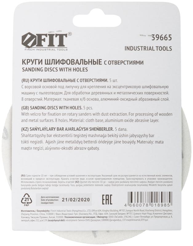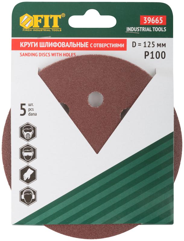 Круг шлифовальный с отверстиями (липучка) алюм./оксид 125мм Р 100 (уп.5шт) FIT 39665
