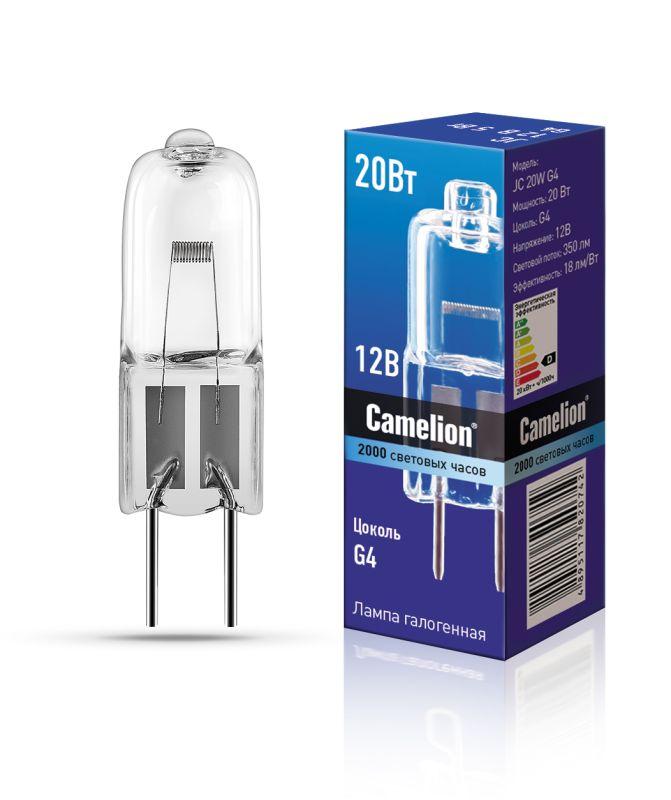 Лампа галогенная JC 20Вт 12В капс. g4 Camelion 1955 – низковольтная лампа без отражателя, с прозрачной колбой, длиной 31 мм, с цоколем g4, мощностью 20 Вт. Цветовая температура 2850 К.