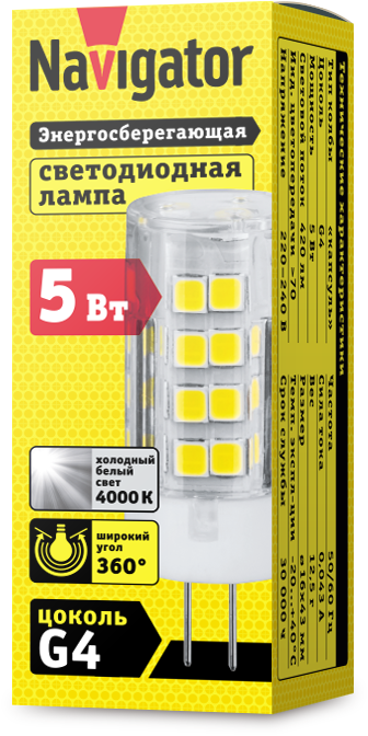 Лампа светодиодная 61 484 NLL-P-G4-5-230-4K 5Вт прозрачная 4000К нейтр. бел. G4 420лм 220-240В Navigator 61484