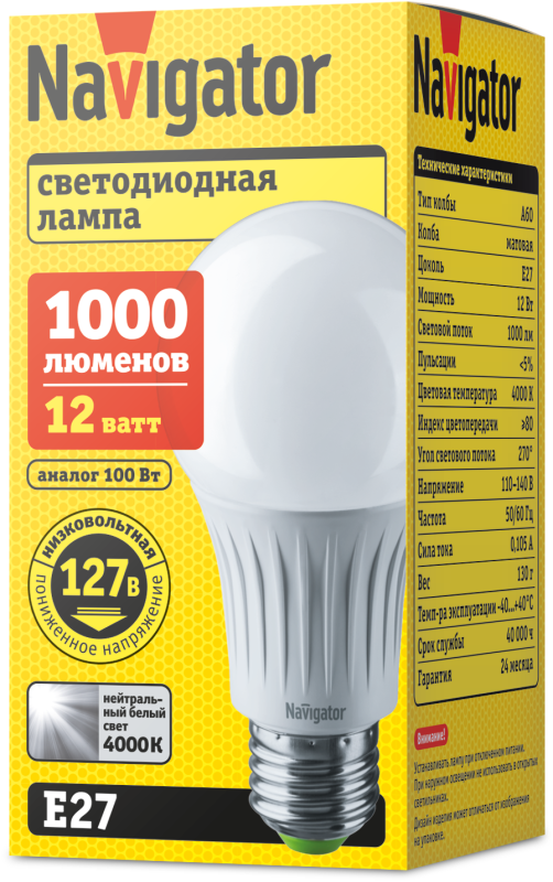 Лампа светодиодная 61 665 NLL-A60-12-127-4K-E27 12Вт грушевидная матовая 4000К нейтр. бел. E27 1000лм 110-140В низковольтная Navigator 61665