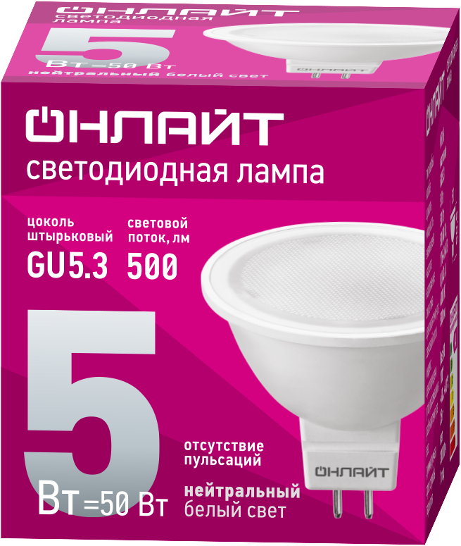 Лампа светодиодная 71 638 OLL-MR16-5-230-4K-GU5.3 ОНЛАЙТ 4670004716380 – лампа с колбой типа "рефлектор", длиной 50 мм, с цоколем GU5.3, мощностью 5 Вт. Цветовая температура 4000 К. Дает нейтральный белый свет. Для натяжных потолков и для потолка из гипсокартона.