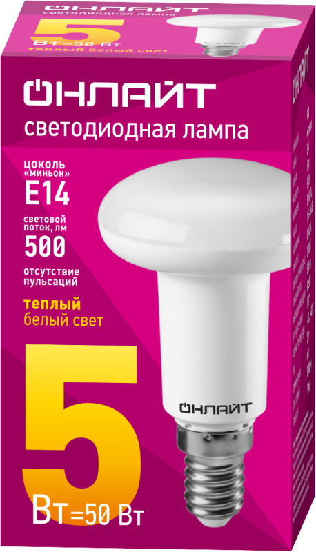 Лампа светодиодная 71 651 OLL-R50-5-230-2.7K-E14 ОНЛАЙТ 4670004716519 388162 388162 – лампа с грибовидной колбой, длиной 85 мм, с цоколем Е14, мощностью 5 Вт. Цветовая температура 2700 К. Дает теплый белый свет.