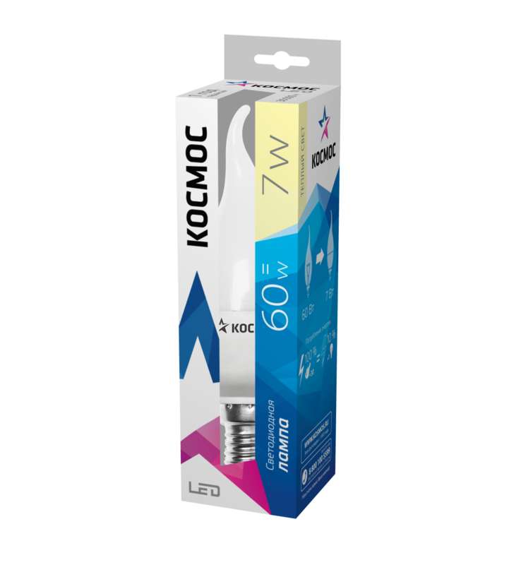 Лампа светодиодная CW 7Вт свеча на ветру 3000К тепл. бел. E14 540лм 220-240В КОСМОС Lksm_LED7wCWE1430
