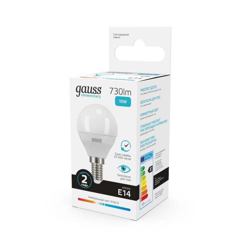 Лампа светодиодная Elementary 10Вт P45 шар 4100К нейтр. бел. E14 730лм GAUSS 53120