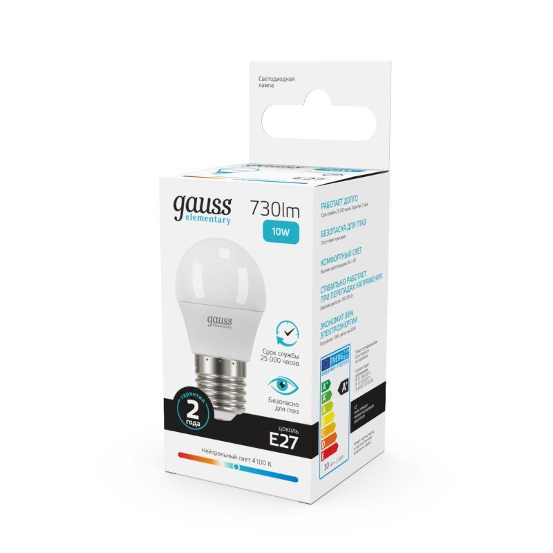 Лампа светодиодная Elementary 10Вт P45 шар 4100К нейтр. бел. E27 730лм GAUSS 53220