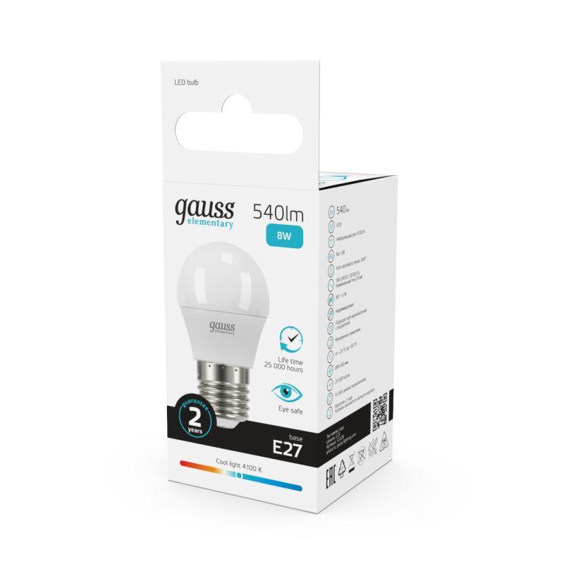 Лампа светодиодная Elementary 8Вт P45 шар 4100К нейтр. бел. E27 540лм GAUSS 53228