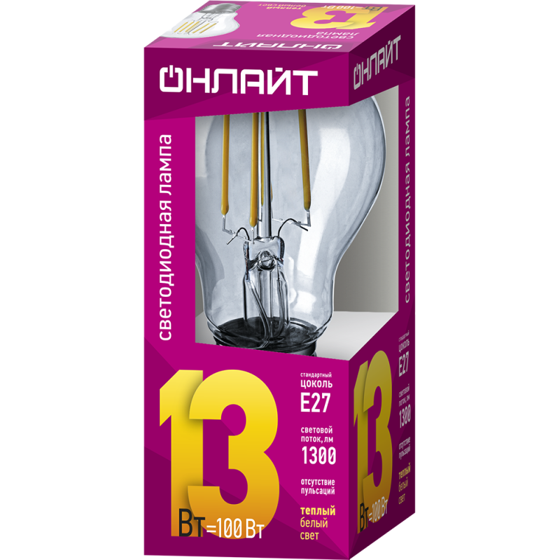 Лампа светодиодная филаментная 80 876 OLL-F-A60-13-230-2.7K-E27 13Вт грушевидная прозрачная 2700К тепл. бел. E27 1300лм 220-240В ОНЛАЙТ 80876