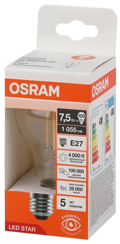 Светодиодные лампы OSRAM - разумная замена традиционным лампам накаливания или галогенным лампам. Светодиодные лампы OSRAM снижают затраты на освещение до 90% при сохранении привычного уровня освещенности. Эта лампа OSRAM серии LED Star выполнена в форме колбы A ("груша") с цоколем E27. Материал колбы - стекло, исполнение - прозрачное. Световой поток 1055 люмен, что соответствует лампе накаливания на 100 Вт. Это филаментная лампа прекрасно выглядит, а потому идеально подходит для открытых светильников и декоративного освещения. Эта лампа излучает нейтральный белый свет, угол пучка - широкий. Качество света на высоте: низкие пульсации защищают глаза, а высокий индекс цветопередачи позволяет видеть мир в его истинном цвете. Кроме того, лампы OSRAM полностью безопасны для здоровья, поскольку в них нет опасных материалов по европейскому стандарту RoHS, а также они не производят вредных электромагнитных излучений, что подтверждено ЭМС (сертификат электромагнитной совместимости). Лампа проработает долго: срок службы - 25000 часов, 5 года гарантии. Светодиодные лампы OSRAM - умный выбор для здоровья семьи и кошелька!