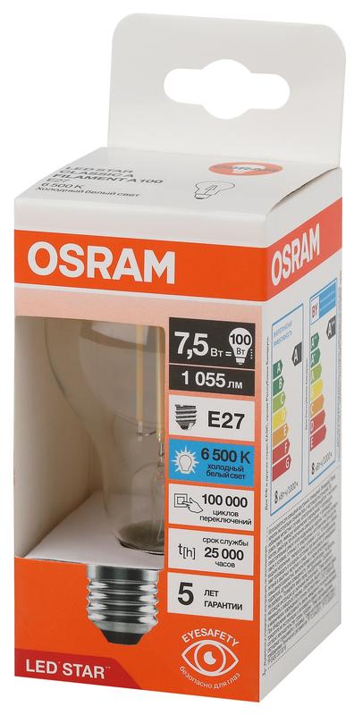 Светодиодные лампы OSRAM - разумная замена традиционным лампам накаливания или галогенным лампам. Светодиодные лампы OSRAM снижают затраты на освещение до 90% при сохранении привычного уровня освещенности. Эта лампа OSRAM серии LED Star выполнена в форме колбы A ("груша") с цоколем E27. Материал колбы - стекло, исполнение - прозрачное. Световой поток 1055 люмен, что соответствует лампе накаливания на 100 Вт. Это филаментная лампа прекрасно выглядит, а потому идеально подходит для открытых светильников и декоративного освещения. Эта лампа излучает холодный белый свет, угол пучка - широкий. Качество света на высоте: низкие пульсации защищают глаза, а высокий индекс цветопередачи позволяет видеть мир в его истинном цвете. Кроме того, лампы OSRAM полностью безопасны для здоровья, поскольку в них нет опасных материалов по европейскому стандарту RoHS, а также они не производят вредных электромагнитных излучений, что подтверждено ЭМС (сертификат электромагнитной совместимости). Лампа проработает долго: срок службы - 25000 часов, 5 года гарантии. Светодиодные лампы OSRAM - умный выбор для здоровья семьи и кошелька!