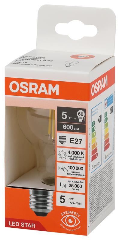 Светодиодные лампы OSRAM - разумная замена традиционным лампам накаливания или галогенным лампам. Светодиодные лампы OSRAM снижают затраты на освещение до 90% при сохранении привычного уровня освещенности. Эта лампа OSRAM серии LED Star выполнена в форме колбы A ("груша") с цоколем E27. Материал колбы - стекло, исполнение - прозрачное. Световой поток 600 люмен, что соответствует лампе накаливания на 60 Вт. Это филаментная лампа прекрасно выглядит, а потому идеально подходит для открытых светильников и декоративного освещения. Эта лампа излучает нейтральный белый свет, угол пучка - широкий. Качество света на высоте: низкие пульсации защищают глаза, а высокий индекс цветопередачи позволяет видеть мир в его истинном цвете. Кроме того, лампы OSRAM полностью безопасны для здоровья, поскольку в них нет опасных материалов по европейскому стандарту RoHS, а также они не производят вредных электромагнитных излучений, что подтверждено ЭМС (сертификат электромагнитной совместимости). Лампа проработает долго: срок службы - 25000 часов, 5 года гарантии. Светодиодные лампы OSRAM - умный выбор для здоровья семьи и кошелька!