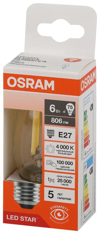 Светодиодные лампы OSRAM - разумная замена традиционным лампам накаливания или галогенным лампам. Светодиодные лампы OSRAM снижают затраты на освещение до 90% при сохранении привычного уровня освещенности. Эта лампа OSRAM серии LED Star выполнена в форме колбы B ("свеча") с цоколем E27. Материал колбы - стекло, исполнение - прозрачное. Световой поток 806 люмен, что соответствует лампе накаливания на 75 Вт. Это филаментная лампа прекрасно выглядит, а потому идеально подходит для открытых светильников и декоративного освещения. Эта лампа излучает нейтральный белый свет, угол пучка - широкий. Качество света на высоте: низкие пульсации защищают глаза, а высокий индекс цветопередачи позволяет видеть мир в его истинном цвете. Кроме того, лампы OSRAM полностью безопасны для здоровья, поскольку в них нет опасных материалов по европейскому стандарту RoHS, а также они не производят вредных электромагнитных излучений, что подтверждено ЭМС (сертификат электромагнитной совместимости). Лампа проработает долго: срок службы - 25000 часов, 5 года гарантии. Светодиодные лампы OSRAM - умный выбор для здоровья семьи и кошелька!