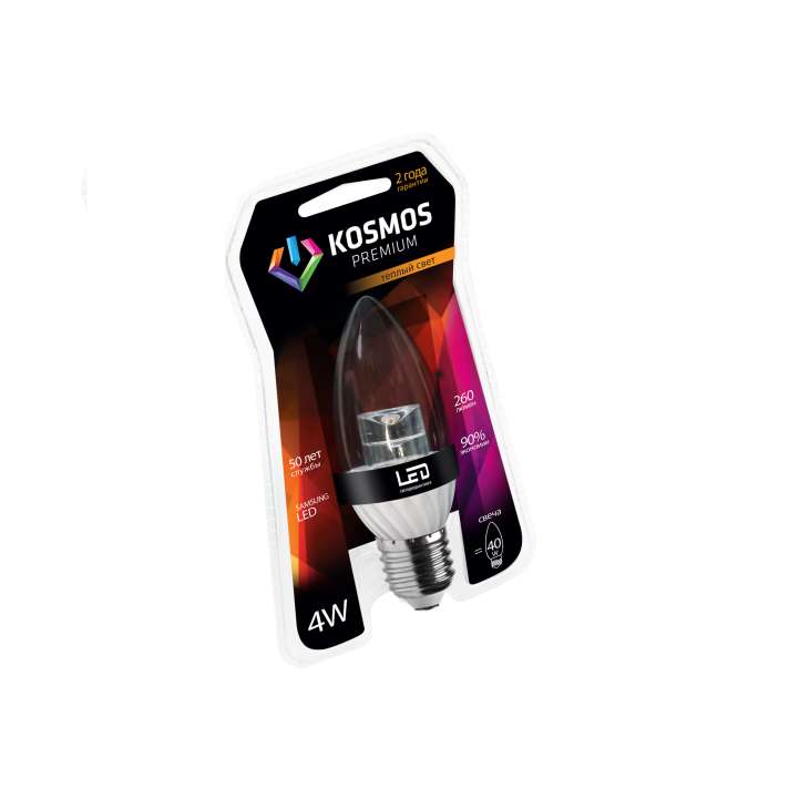 Лампа светодиодная KOSMOS premium 4Вт свеча прозрачная E27 230В 3000К Космос KLED4wCN230vE2727CL