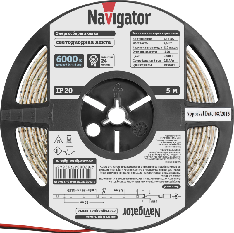 Лента светодиодная 71 764 NLS-3528CW120-9.6-IP20-12V R5 (уп.5м) Navigator 4670004717646 – средство освещения. Представляет собой полосу длиной 5 м, со светодиодами в количестве 120 шт./1 м, с длиной секции 50 мм. Самоклеющаяся, без адаптера подключения. Дает белый свет. Цветовая температура 6000 К. Применяется в целях декоративного освещения и как способ оформления светодизайна помещений, витрин, фасадов, рекламных щитов и проч.