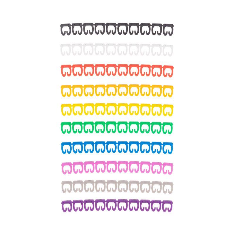 Маркеры с цифрами от 0 до 9 предназначены для маркировки проводов и кабелей в распределительных щитах. Облегчают идентификацию проводов в процессе монтажа и демонтажа проводки, помогают определить группу кабелей и источников при обслуживании и диагностике. Маркеры изготавливаются из эластичного и негорючего поливинилхлорида. Рабочая температура не должна превышать 85 °C. Благодаря специальной эластичной форме каждый маркер надежно фиксируется на проводах с сечением от 4 до 6 мм. Предусмотрено отверстие для проводника. Каждая цифра имеет свой цвет: черный, красный, оранжевый, желтый, зеленый, синий, фиолетовый, серый, белый, розовый. Маркеры соединяются между собой с помощью зубцов и пазов.
