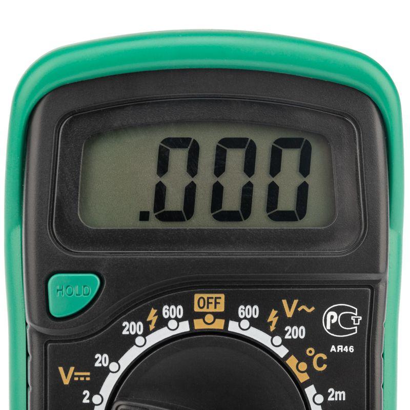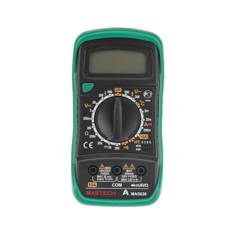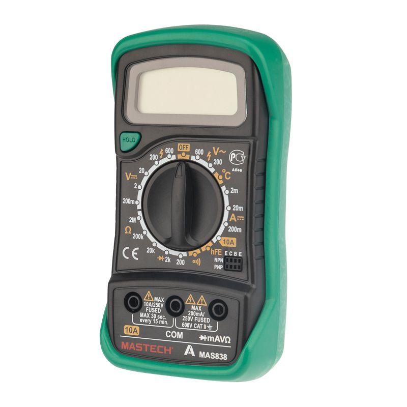 Портативный мультиметр MASTECH MAS838 – прибор, который измеряет постоянное и переменное напряжение, постоянный ток, сопротивление в цепи, температуру. С помощью данного устройства можно проводить тестирование диодов и прозвонку целостности цепи. Прибор оснащен функцией удержания результата измерений DATA HOLD: используется в случае проведения работ в труднодоступных местах. Поворотный регулятор для выбора измеряемых величин и их пределов усилен для исключения возможности случайного нажатия. Мультиметр укомплектован термопарой «К»-типа, измерительными щупами, батареей и руководством по эксплуатации. Прибор изготовлен из высококачественных материалов, калибровка и тестирование приборов произведены под контролем компании СДС. Характеристики: Постоянное напряжение: 200 mВ/2 В/20 м/200 В (±0.5% +3), 600 В (±0.8% +5) Переменное напряжение: 200 В/600 В (±1.2% +10) Постоянный ток: 20 мкА/200 мкА/2 мА/20 мА/200 мА (±1.0% +3), 10 A (±3.0% +10) Сопротивление: 200 Ом/2 КОм/20 КОм/200 КОм (±0,8% +2), 2 МОм (±1,0% +5) Температура: –20...+1000 °С (±2.0% +2) Тестирование диодов: да Прозвонка целостности цепи: да Импеданс: <50 Ом Рабочая температура: 0...+40 °С Размер: 138х69х31 мм Тип батареи: 9 В «Крона» Принадлежности: устройство, комплект измерительных щупов, батарея 9 В, термопара «К»-типа, инструкция и упаковка Преимущества: Режим удержания измерений DATA HOLD Индикация разряда батареи Ручной выбор предела измерений 4-разрядный дисплей Небольшой вес
