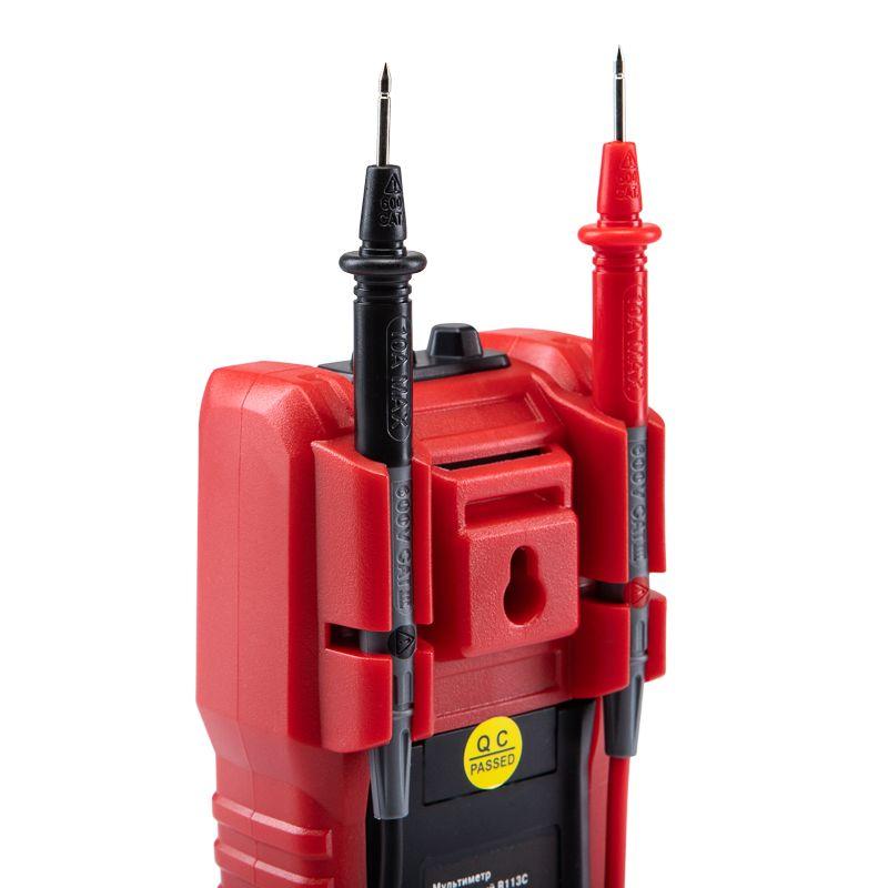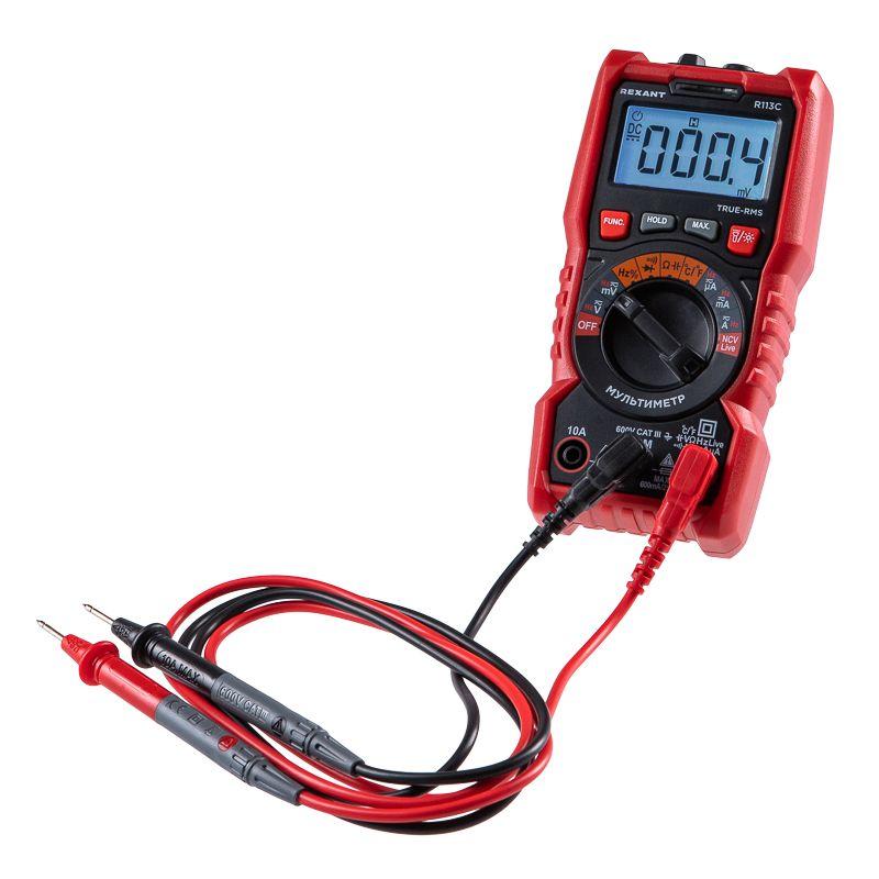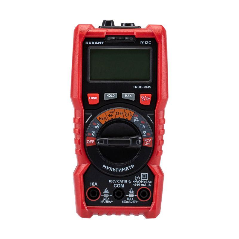 Портативный цифровой мультиметр R113C REXANT сочетает высокую точность, удобство использования и широкий спектр функций. Позволяет измерить постоянный и переменный ток, емкость, частоты и скважность, а также определить фазу и нейтраль. Среднеквадратичный метод измерения значений (True RMS) гарантирует точные результаты измерений. Мультиметр имеет автоматический выбор диапазонов измерений. Оснащен бесконтактным детектором напряжения NCV. Параметры измерений: Постоянное напряжение: 600мВ/6В/60В/600В ± (0.5%) Переменное напряжение: 600мВ/6В/60В/600В ± (1.0%) Постоянный ток: 600мкA/6000мкA/60мA/600мA ± (1.2%) 10A ± (2,0%) Переменный ток: 600мкА/600мкA/60мA/600мA ± (1.5%)10A ± (2,0%) Сопротивление: 600 Ом/6кОм/60кОм/600кОм/6MОм/60MОм ± (1.0%) Емкость: 10нф/100нф/1мкф/10мкф/100мкф/1мф/10мф ± (4.0%) 100мф ± (5.0%) Частота: 10Гц/100Гц/1кГц/10кГц/100кГц/1MГц/10MГц ± (1.0%) Скважность: 1%-99% ± (3.0%) Температура: от -20 °С до +1000 °С ± (3.0%)? Основные функции и особенности: Автоматический выбор пределов измерений Среднеквадратичный метод измерения значений – True RMS Режим максимальных измерений (MAX) Функция памяти данных DATA HOLD Режим «прозвонка», диод- тест Световая и звуковая индикация нейтрали/фазы (LIVE TEST) Бесконтактный детектор напряжения NCV с индикацией Разрядность дисплея: 6000 отсчетов Количество измерений в секунду: 3 Указатель отрицательной полярности на дисплее Функция подсветки рабочей области и дисплея Защитный кожух, крепеж щупов, подставка Автоматическое отключение подсветки через 10 сек. Автоматическое отключение питания через 15 минут Батареи: 1.5 В ААА, 2 шт. Вес: 220 г Габариты: 151х75х46 мм Комплект поставки: мультиметр, измерительные щупы, батареи, инструкция
