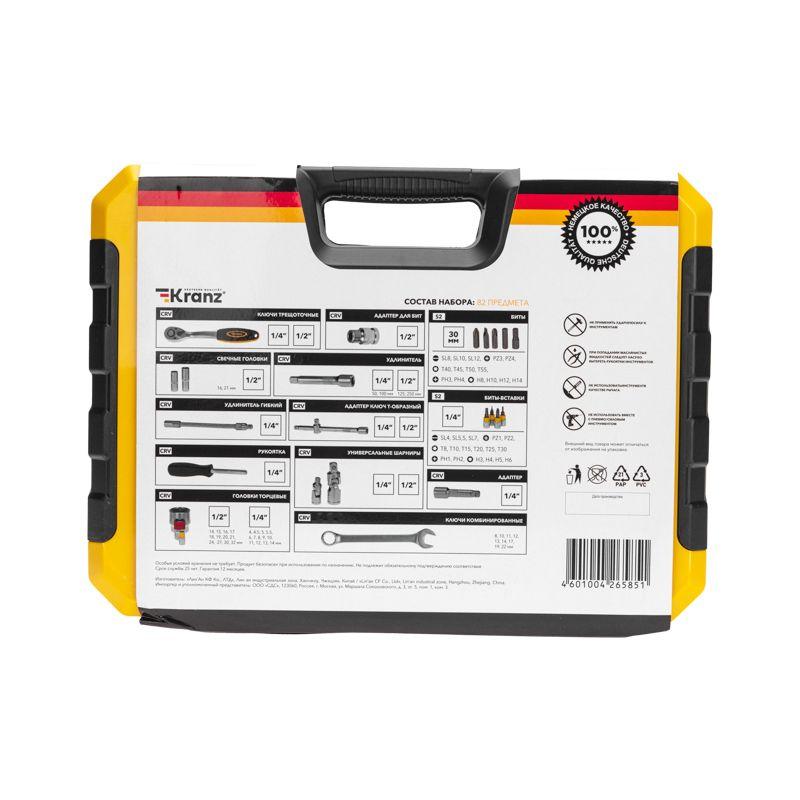 Набор инструментов KRANZ 1/2 и 1/4 дюйма, CrV, состоит из 82 предметов в пластиковом кейсе и предназначен для выполнения различных слесарно-монтажных работ. В набор входят: Головки торцевые 1/4”: 4, 4.5, 5, 5.5, 6, 7, 8, 9, 10, 11, 12, 13, 14 мм Биты 1/4": PH1, PH2, PZ1, PZ2, H3, H4, H5, H6, SL4, SL5.5, SL7, T8, T10, T15, T20, T25, T30 Универсальный шарнир 1/4” Адаптер 1/4” Трещоточный ключ 72 зубчика 1/4” Рукоятка 1/4”: 160 мм Удлинитель 1/4”: 50,100 мм Адаптер ключ Т- образный 1/4" Гибкий удлинитель 1/4”: 160 мм Головки торцевые 1/2”:14, 15, 16, 17, 18, 19, 20, 21, 24, 27, 30, 32 мм Головки свечные 1/2”: 16, 21 мм Удлинитель 1/2”: 125, 250 мм Универсальный шарнир 1/2” Трещоточный ключ 72 зубчика 1/2” Адаптер для бит 1/2” Адаптер ключ Т-образный 1/2" Биты 8х30 мм: PH3, PH4, PZ3, PZ4, H8, H10, H12, H14, SL8, SL10, SL12, T40, T45, T50, T55 Ключи комбинированные: 8, 10, 11, 12, 13, 14, 17, 19, 22 мм Кейс