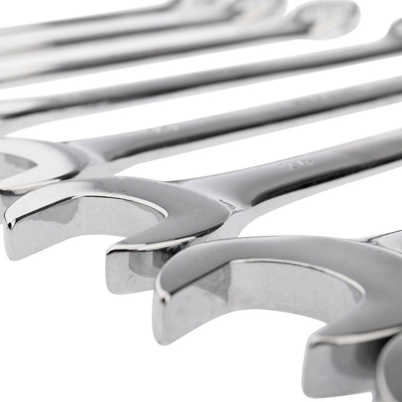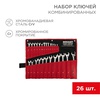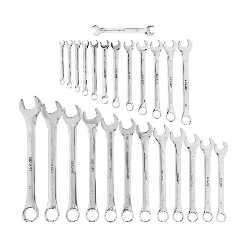 Набор гаечных комбинированных ключей предназначен для монтажа, демонтажа резьбовых соединений. С одной стороны ключа расположен захват открытого типа, с другой – накидного (кольцевого) типа. Кольцевой захват имеет 12 граней, благодаря чему улучшается сцепление с крепежом и уменьшается риск повреждения граней крепежа. Ключи изготовлены из высококачественной хромованадиевой стали (CrV). Материал обладает такими свойствами, как прочность, жесткость и устойчивость к износу. Набор состоит из 26 предметов. Размеры: 6-28, 30, 32 мм + рожковый ключ 10х13 мм. Твердость материала рабочей части ключа: 45-48 HRC.