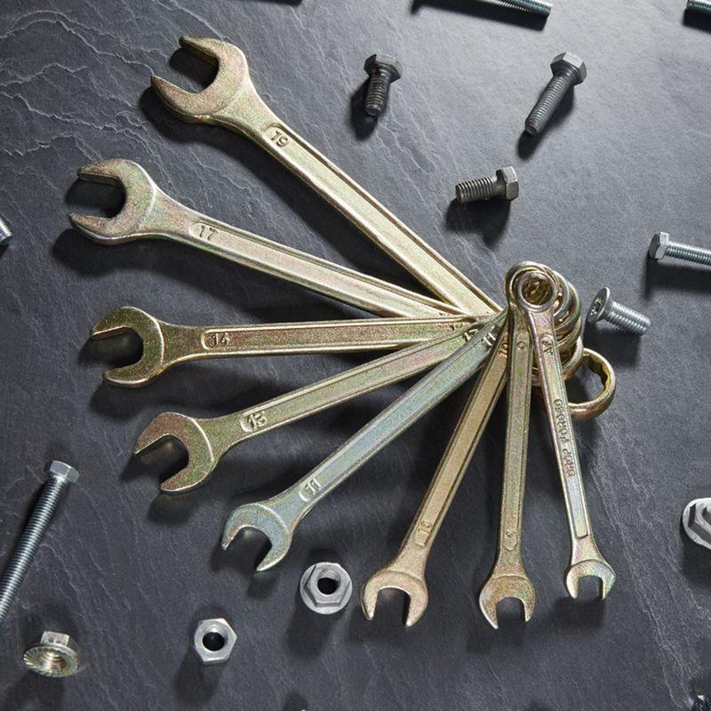 Набор комбинированных гаечных ключей REXANT предназначен для монтажа и демонтажа резьбовых соединений: болтов, гаек, муфт и т. д. Применяется в быту, слесарных мастерских и на производстве. Инструменты имеют рожковый профиль с одной стороны, а с другой – накидной. Изготовлены из качественного сплава, который выдерживает значительное давление. Желтое оцинкованное покрытие препятствует образованию коррозии. Комбинированные ключи имеют долгий срок службы, просты в обращении и обеспечивают доступ к любому крепежу. Для удобства хранения и транспортировки набор поставляется в пластиковом футляре. Размеры ключей в наборе: 8, 9, 10, 11, 13, 14, 17, 19 мм