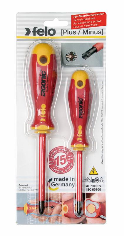 Набор диэлектрических крестовых отверток Felo предназначен для проведения электромонтажных работ под напряжением до 1000 Вольт. ERGONIC - первая в мире рукоятка, которая адаптируется под руку пользователя. Её гладкая бесшовная ручка и эргономичная форма рукоятки увеличивают комфорт при работе. Дизайн рукоятки не позволяет инструменту скатываться с поверхности, а отверстие в рукоятке изделия позволяет применять дополнительное усилие при работе в качестве рычага. На верхней части рукоятки указан тип шлица. Ударопрочный стержень отвёртки проходит по всей длине рукоятки. Стержень изготовлен из хром-молибден-ванадиевой стали, закалённой в масле, износостойкость которой превышает технические требования европейских стандартов DIN и ISO. Состав набора: Отвертка PZ1x80, PZ2x100.