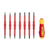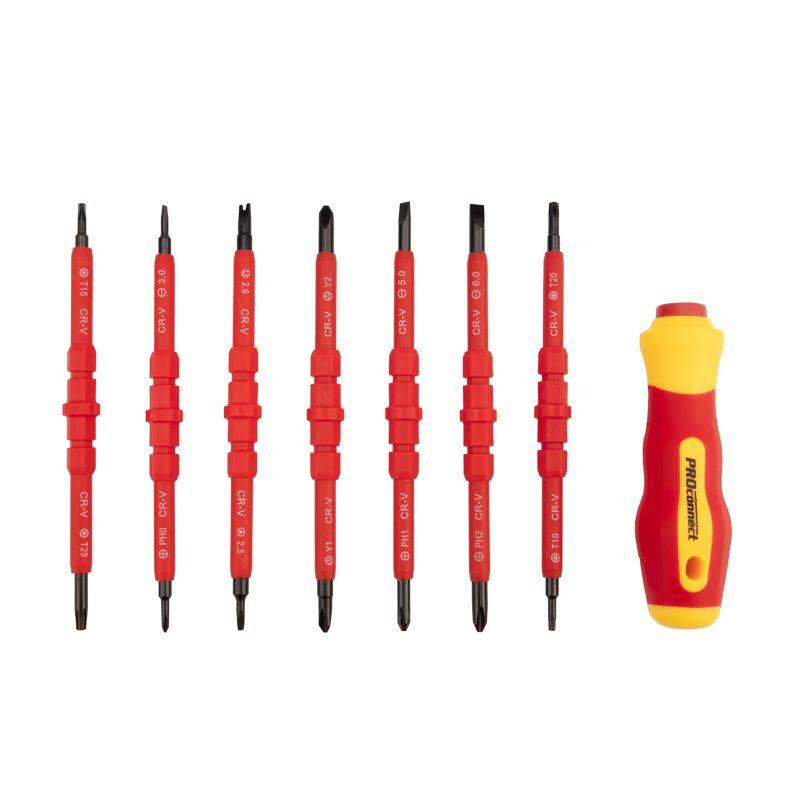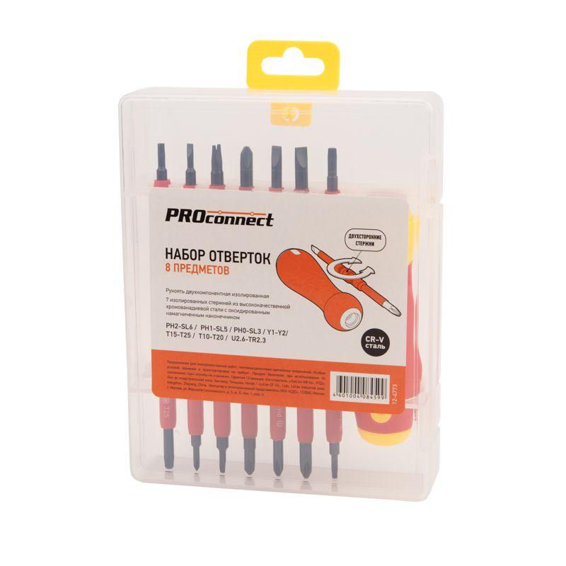 Набор отверток PROconnect 8 в 1 предназначен для электромонтажных работ, монтажа/демонтажа крепежных соединений: шурупов, саморезов и т. д. Двухсторонние диэлектрические стержни отвертки, изготовленные из высококачественной хромованадиевой стали, покрыты специальным изоляционным материалом и обладают оксидированными намагниченными наконечниками. Корпус эргономичной изолированной рукоятки выполнен из пластика, не скользит в ладони, что обеспечивает дополнительный комфорт при работе. Набор поставляется в пластиковом боксе для удобства хранения и транспортировки. Характеристики: Типы шлицев: PH2-SL6, PH1-SL5, PH0-SL3, Y1-Y2, Т15-Т25, Т10-Т20, U2.6-TR2.3 Размеры двусторонних стержней: 160 мм Количество стержней: 7 шт. Рукоять отвертки: да Материал стержней: CrV сталь, ABS-пластик Материал отвертки: ABS-пластик Материал бокса: ABS-пластик