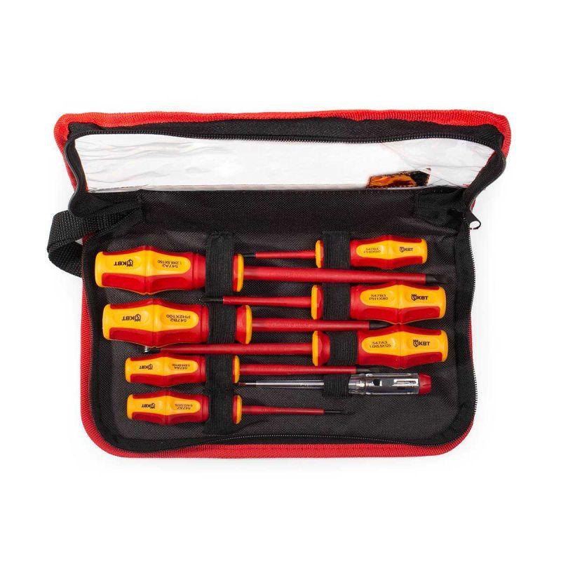 • Состав набора: • Отвертка диэлектрическая шлиц 2.5х75 • Отвертка диэлектрическая шлиц 4.0х100 • Отвертка диэлектрическая шлиц 5.5х125 • Отвертка диэлектрическая шлиц 6.5х150 • Отвертка диэлектрическая РН0х60 • Отвертка диэлектрическая PH1х80 • Отвертка диэлектрическая PH2х80 • Отвертка индикаторная • Для работ под напряжением до 1000 В • Двухкомпонентные эргономичные рукоятки с мягкими прорезиненными вставками • Маркировка на торце рукояток с обозначением типа профилей • Специальная форма рукояток, не позволяющая инструменту скатываться с наклонной поверхности • Стержни из высокопрочной стали S2 • Намагниченные наконечники • Упаковка: кофр на молнии с прозрачной крышкой • Вес набора: 576 г