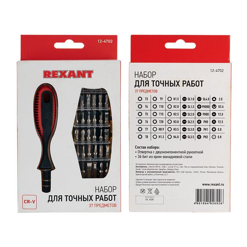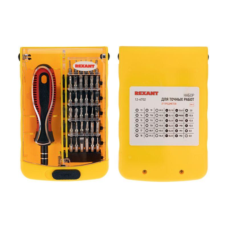 Набор отверток для точечных работ арт.12-4702 REXANT 37 предметов предназначен для выполнения прецизионных работ в электронике и электромеханике. Биты набора выполнены из хромованадиевой стали. Эргономичная двухкомпонентная рукоятка отвертки делает работу с инструментом легкой и удобной. Магнитный держатель обеспечивает быструю замену и надежную фиксацию насадок. Набор поставляется в пластиковом боксе и содержит 37 предмета: Отвертка 1 шт. Биты 36 шт. (Н 0,9, Н1,3, H 1.5, H 2.0, H 2.5, H 3.0, H 3.5, H 4.0, SL1.0, SL1.5, SL 2.0, SL 2.5, SL3.0, SL3.5, SL4.0, PHOOO, PHOO, PH0, PH1, PH2, ^2.0, Y2.0, Y2.5, ?0.8, Т3, Т4, T5 ,T6, T7, T8, Т9, T10, Т15, Т20, ?0,8, U2,6).