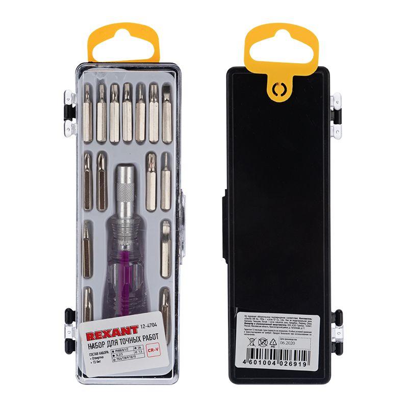 Набор отверток для точных работ арт. 12-4704 REXANT 16 предметов предназначен для выполнения прецизионных работ в электронике и электромеханике. Эргономичная прозрачная двухкомпонентная рукоятка отвертки делает работу с инструментом легкой и удобной. Биты набора выполнены из хромованадиевой стали. Магнитный держатель обеспечивает быструю замену и надежную фиксацию насадок. Набор поставляется в пластиковом боксе и содержит 16 предметов: Отвертка 1 шт. Биты 15 шт. (PH00, PH0, PH1, PH2, T5, T6, T7, T8, T9, T10, T15, U4, ?, SL2, SL3).