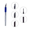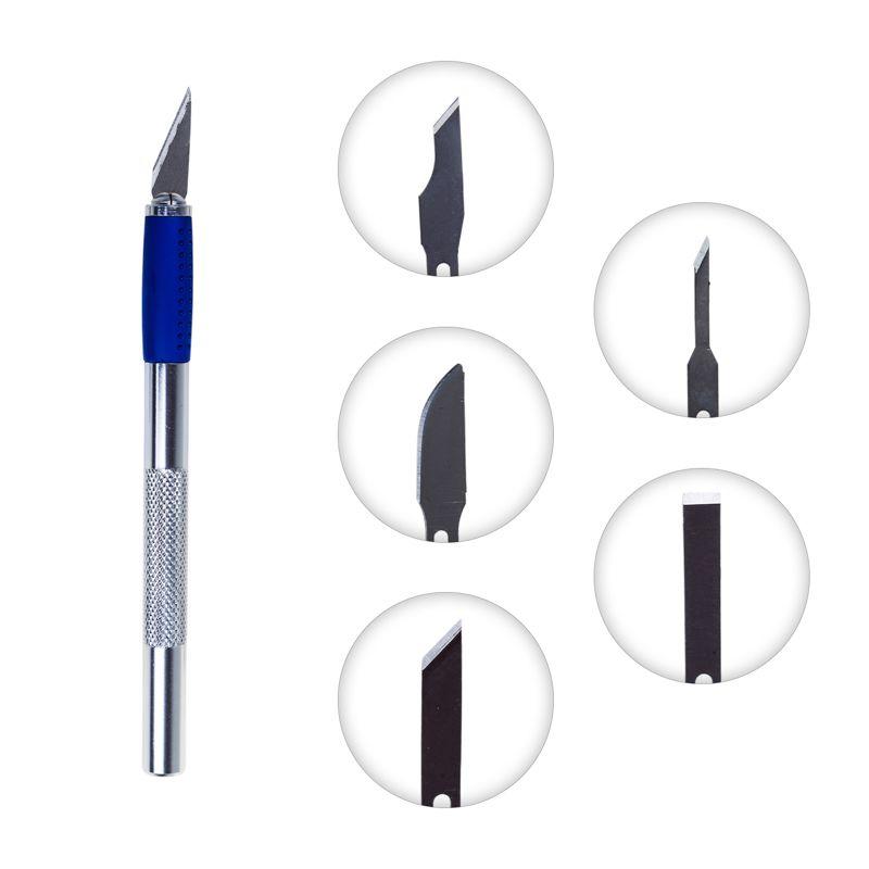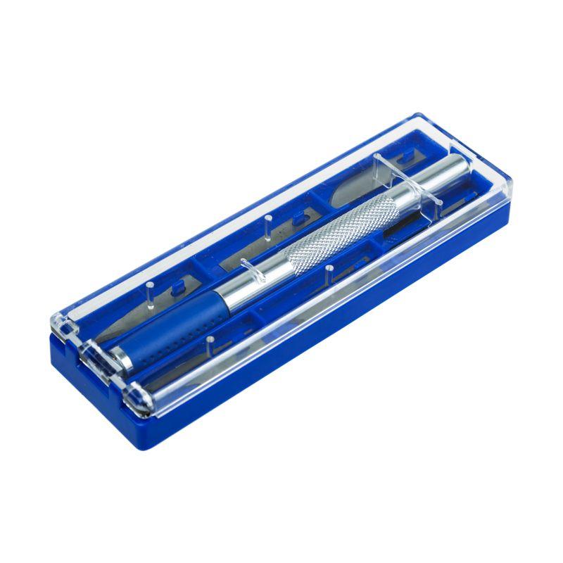 Скальпель REXANT со сменными стальными лезвиями предназначен для проведения художественных и дизайнерских работ: декорирования резными элементами, декупажа, квиллинга, скрапбукинга, пэчворка и др. Подходит для реза различных материалов: бумаги, фольги, древесины, пластика, ткани, кожи. Цанговый зажим ножа обеспечивает крепкую фиксацию лезвий и их быструю смену. Для комфортного пользования скальпелем предусмотрена резиновая вставка. В основании металлической рукоятки есть магнит, благодаря которому удобно и безопасно извлекать лезвия из футляра. Для удобства хранения и транспортировки набор поставляется в пластиковом кейсе. Длина лезвия – 25 мм, ширина – 5 мм, толщина – 0,5 мм. Длина рукоятки – 127 мм, ширина – 8 мм.