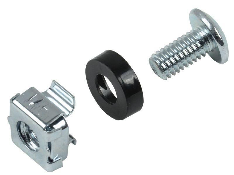 Набор винт-шайба-гайка необходим для крепления оборудования на монтажные профили шкафов и стоек. Гайки в наборе имеют квадратную форму и специальные "лапки", прочно фиксирующие их в квадратном отверстии монтажных профилей, что облегчает установку оборудования, т.к. нет необходимости держать гайку руками. Также в наборе предусмотрены пластиковые шайбы, предотвращающие повреждение оборудования при затягивании винтов в гайку.