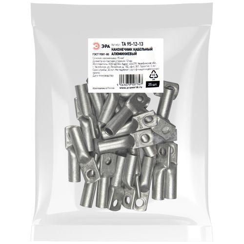 Наконечник кабельный алюминиевый ЭРА ТА 95-12-13 используется для оконцевания проводов и кабелей с алюминиевыми жилами сечением до 95 мм? и применяется для кабелей напряжением до 35 кВ. Предназначен для присоединения кабелей и проводов к алюминиевым шинам и выводам электротехнических устройств. Для оконцевания проводников необходимо использовать специальный обжимной инструмент. Наконечники ТА изготавливаются из алюминиевой трубы марки АД1М. Силовые наконечники ЭРА серии ТА произведены в соответствии с ГОСТ 9581-80.