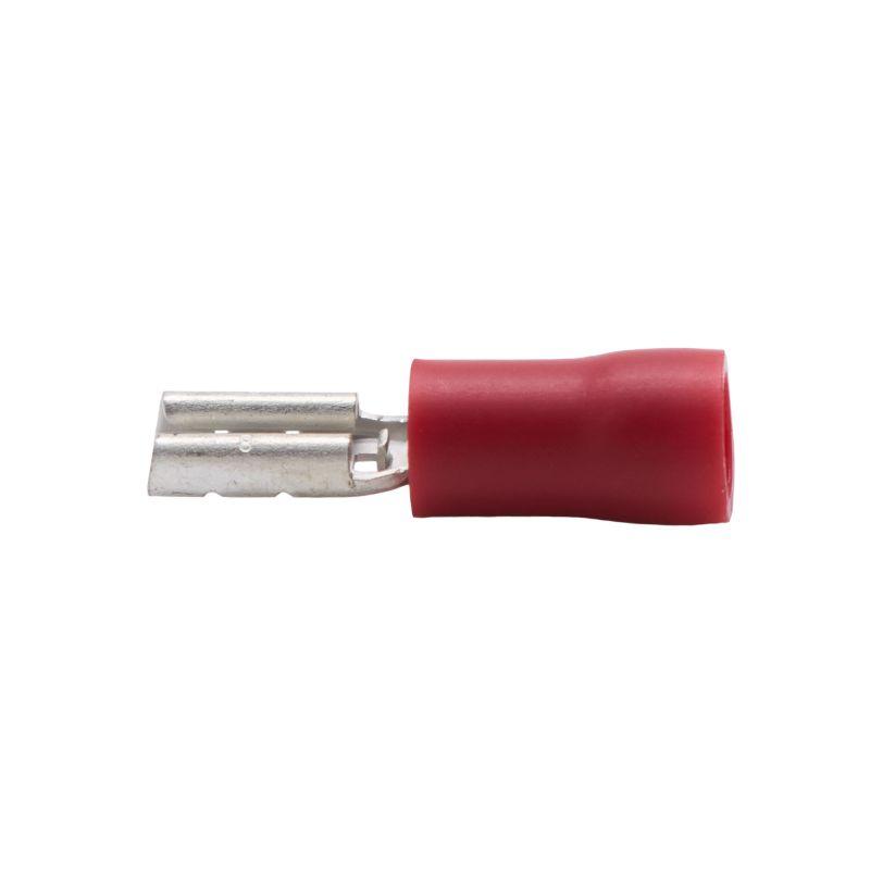 Плоские наконечники быстрого соединения (розетка "мама") предназначены для оконцевания кабеля и проводов с медными жилами сечением от 0.25 до 1.5 мм2 в электрических цепях переменного и постоянного тока, напряжение до 600 В. Материал контактной части – электротехническая медь, материал изоляции - ПВХ. Луженое покрытие обеспечивает защиту от коррозии. Фланец изолирован. Номинальный размер соединителя 4,8?0,8 мм2. Цвет - красный.