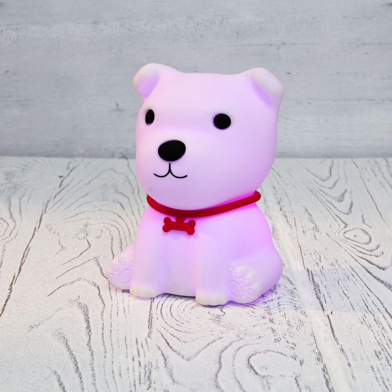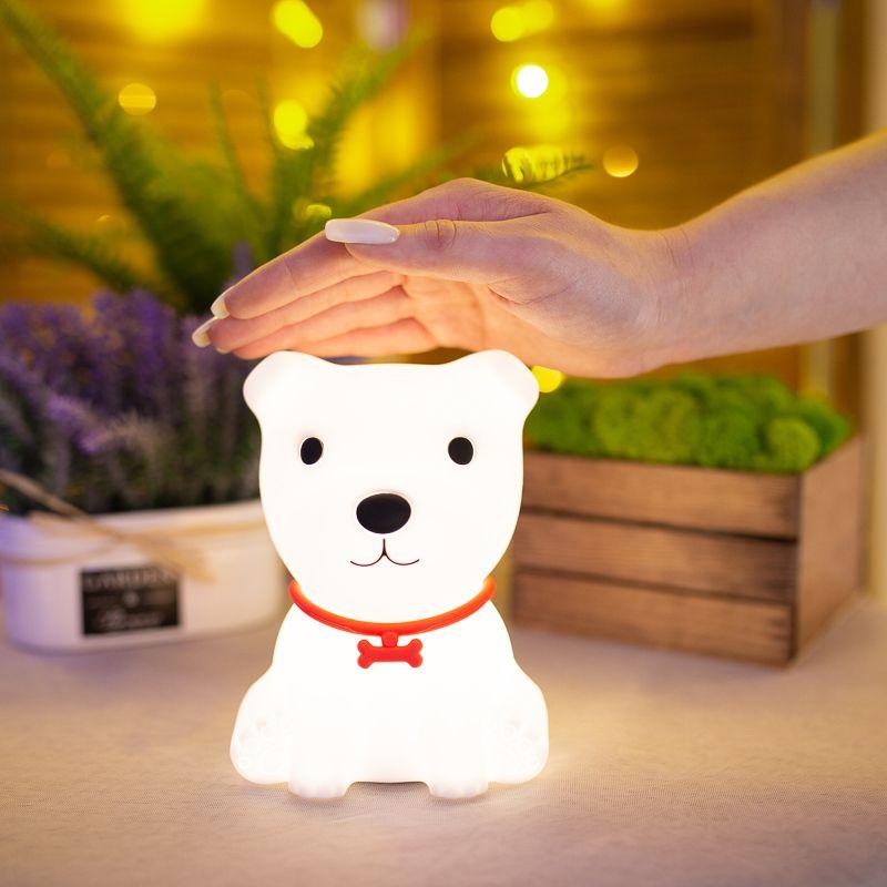 Силиконовый ночник «Щенок» выполнен из мягкого материала, приятного на ощупь. Забавный персонаж придется по душе каждому ребенку, станет его лучшим другом, который поможет быстро и крепко заснуть. Ночник светится теплым белым цветом, плавно меняет оттенки RGB-диодов или светится одним цветом из 256 вариантов. Изделие не нагревается, не имеет неприятного запаха, острых углов и опасных деталей. Ночник заряжается через USB-порт, одного объема аккумулятора хватает на 9-10 часов.