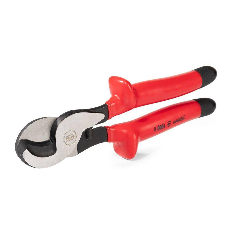 • Для работы под напряжением до 1000 В • Диапазон резки: кабели O до 16 мм • Твердость лезвий HRC 32...40 • Материал рукояток: двухслойная диэлектрическая пластизоль. Внутренняя изоляция – желтого цвета, внешний слой изоляции – красного цвета • Специальные упоры на рукоятках обеспечивают защиту от соскальзывания • Усиленная кованая конструкция • Резка провода до 70 мм2 • Длина 240 мм • Вес 440 г