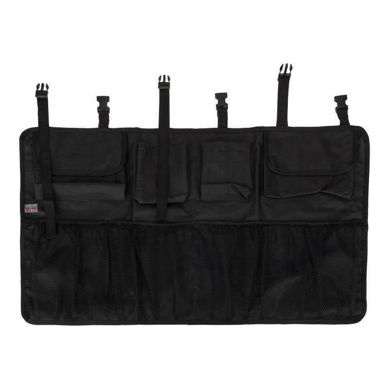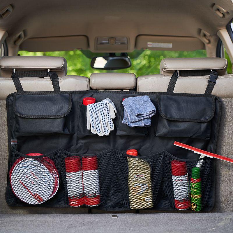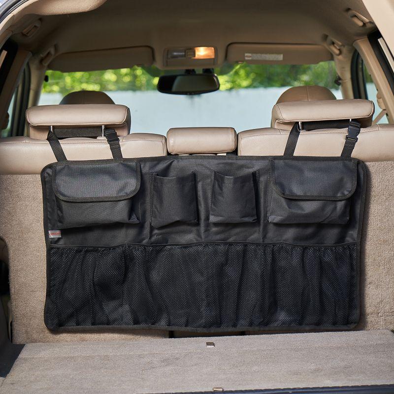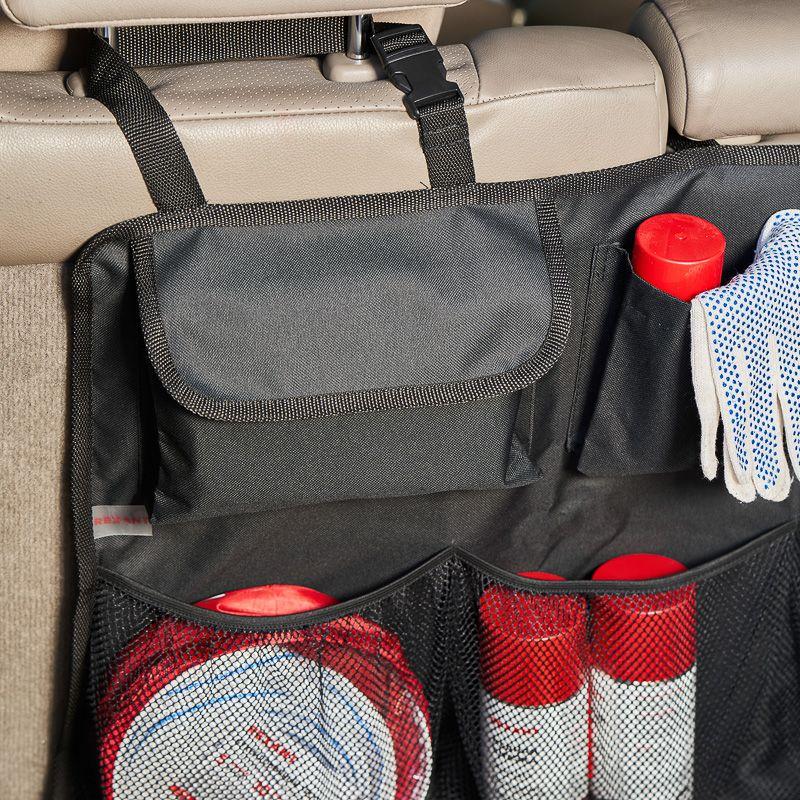 Органайзер на спинку заднего сиденья (большой) – это функциональный аксессуар, разработанный для организации и хранения различных предметов в багажнике автомобиля. Изделие представляет собой прочный и просторный органайзер, который крепится за подголовники спинки заднего сиденья (закрывает всю площадь спинки). Органайзер оснащен 8 вместительными карманами различных размеров, что позволяет удобно разместить много предметов. Изготовлен из износостойкого и прочного материала, который легко чистится от пыли, грязи или пятен.