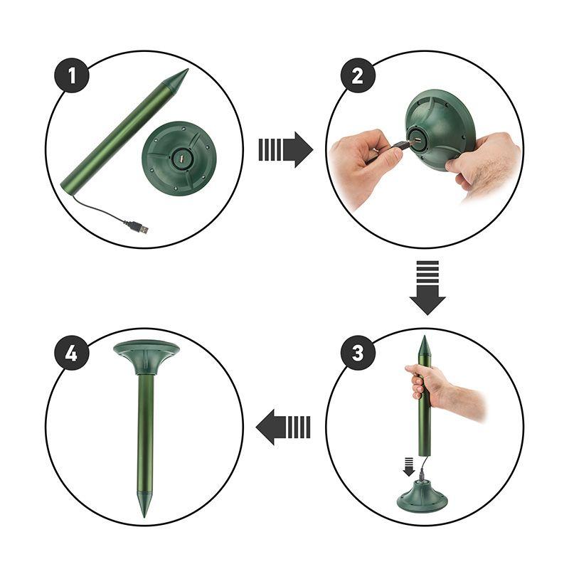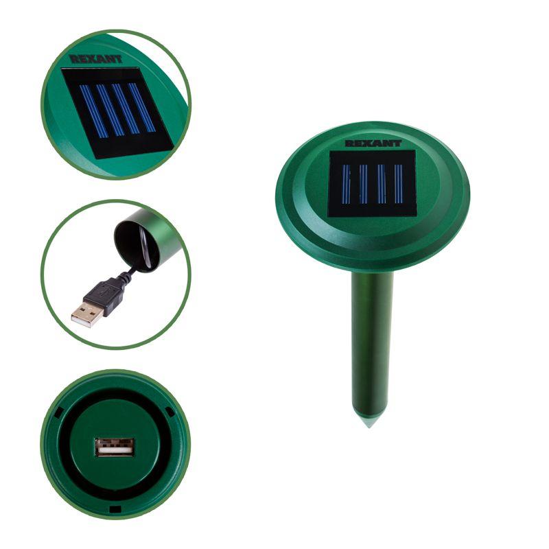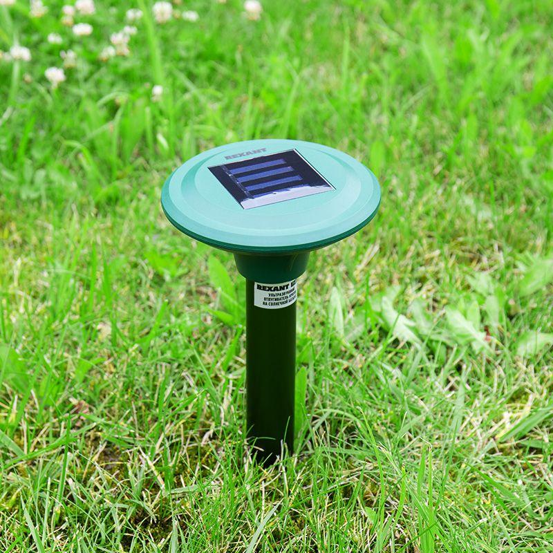 Ультразвуковой отпугиватель кротов REXANT предназначен для избавления от земляных вредителей на дачном участке и защиты урожая. Оснащен солнечной батареей. Отпугиватель работает за счет высокочастотных звуковых волн, которые не слышны для человека, но очень неприятны для кротов. Грызуны, находящиеся в области действия устройства, становятся беспокойными и уходят, не причиняя вреда растениям. Изделие безопасно для людей и домашних животных, не содержит химикатов. Радиус действия составляет до 30 метров. Однако на охватываемую площадь влияет тип почвы, фундамент построек и камни.