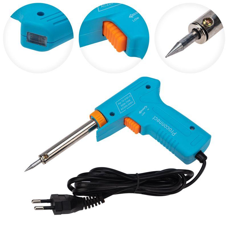 Паяльник-пистолет двухрежимный серии Classic мощностью 30/70Вт PROconnect предназначен для ручного монтажа/демонтажа электронных компонентов и других мелких и средних деталей. Конструктивные особенности: рукоятка в форме пистолета, возможность осуществлять пайку в двух режимах мощности 30Вт и 70 Вт. Наличие 2-х режимов мощности обеспечит экономичное энергопотребление. Максимальная мощность и ускоренный разогрев активируются нажатием и удержанием кнопки, расположенной на рукоятке. Это позволяет мастеру сначала установить жало инструмента в определенную точку пайки, а затем перевести паяльник в максимальный рабочий режим. Долговечное жало паяльника состоит из медьсодержащего сердечника, покрытого слоем хрома. В случае необходимости его можно легко и быстро заменить (сменное жало в комплект не входит). На корпусе расположен индикатор включения.
