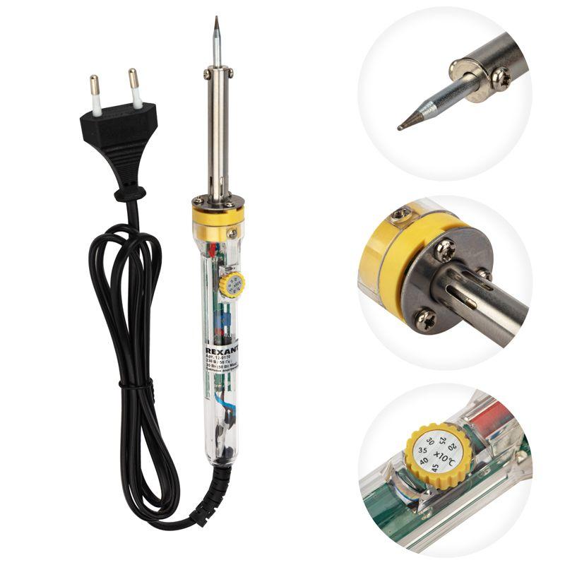 Паяльник с регулировкой температуры мощностью 30-50Вт REXANT предназначен для ручного монтажа/демонтажа электронных компонентов и других мелких и средних деталей. Подходит как для любительского, так и для профессионального использования. Функционал прибора позволяет с помощью регулятора менять рабочую температуру жала в диапазоне 200...450°C. Долговечное жало паяльника состоит из медьсодержащего сердечника, покрытого слоем электролитически осажденного железа, отличающегося высокой стойкостью к коррозии. При соблюдении ряда предосторожностей жало способно работать длительное время без утраты эксплуатационных свойств, а в случае необходимости его можно легко и быстро заменить (сменное жало в комплект не входит). На рукоятке расположен индикатор включения и регулятор температуры. Удобная рукоятка выполнена из термостойкого пластика, что сделает работу с инструментом легкой и приятной.