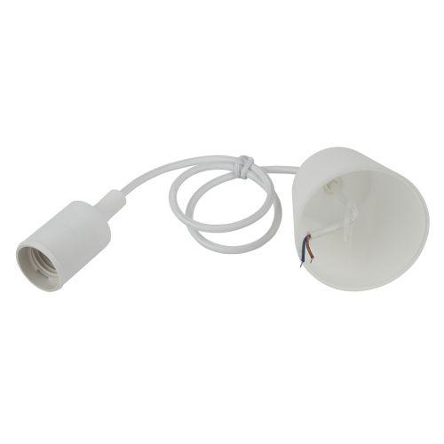 патрон с подвесом, длина провода 80 см, изготавливается из термостойкого пластика, материал химически устойчивый к агрессивным средам, обладает высокой прочностью и теплостойкостью; не обладает способностью выдерживать высокие температуры нагрева, поэтому его чаще всего используют для ламп накаливания мощностью не более 60 Вт. Есть регулировка длины шнура.