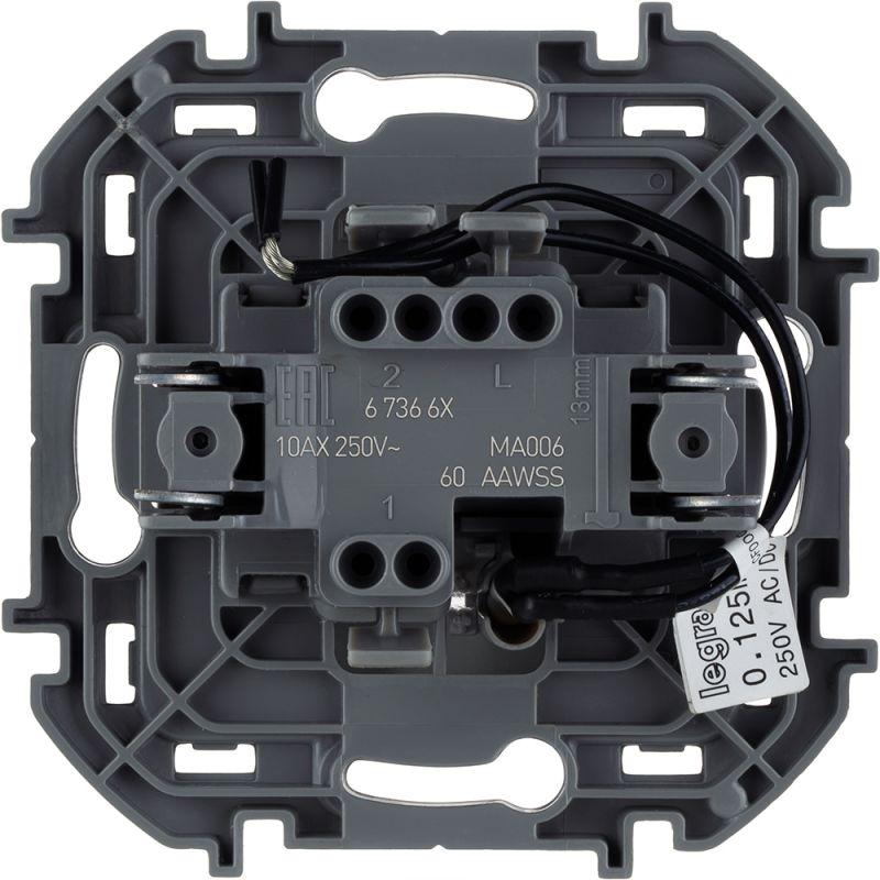 Переключатель одноклавишный с подсветкой/индикацией Legrand Inspiria для скрытого монтажа,цвет "Алюминий", номинальный ток 10 А, напряжение ~250В. Предназначен для установки в электрических сетях жилых и общественных зданий и используется для управления приборами освещения, вентиляции и т.д. Используется для управления нагрузкой с одного, двух или более мест (совместно с промежуточными выключателями). Оснащен светодиодной лампой для подсветки или индикации. Особенности изделия: - Компактный механизм с глубиной всего 20 мм. комфортно размещается в различных монтажных коробках. - Материал клавиш - глянцевый пластик АБС, стоек к выгоранию и загрязнениям. - Все токоведущие части выключателя имеют защиту от случайного прикосновения. - Безвинтовые зажимы для присоединения проводов обеспечивают быстрое подключение и отключение, гарантируют надежное и долговечное соеднинение и не требуют обслуживания. - Удобные широкие толкатели облегчают работу по демонтажу провода. - Улучшенная эргономика снижает вероятность искрения при коммутации светодиодов. - Ход клавиши короткий, не громкий. - Универсальная LED-лампа белого цвета с низким энергопотреблением 0.125мА и возможностью замены - Благодаря свободной схеме подключения, лампа подсветки либо облегчает ориентирование в темноте, либо информирует о включении нагрузки. - Клавиша оборудована линзой для заметного светового сигнала подсветки или индикации.