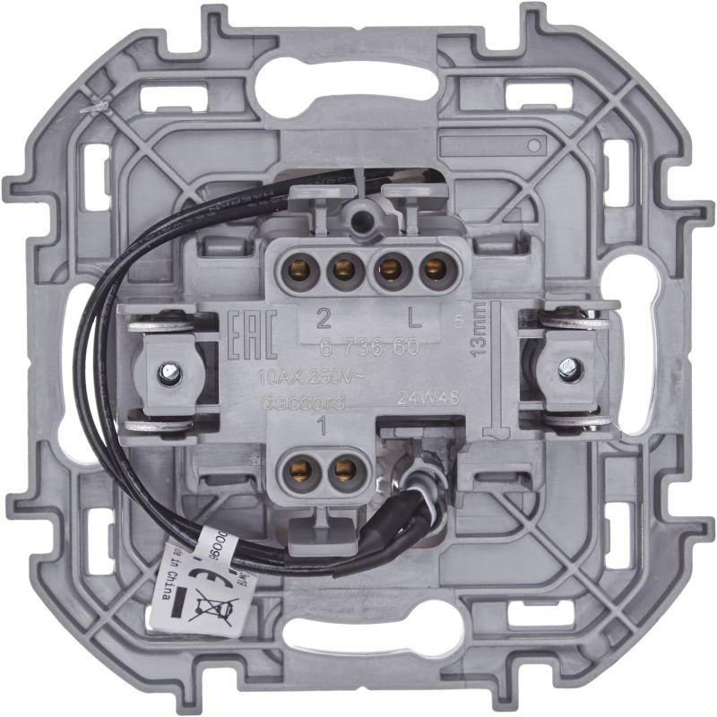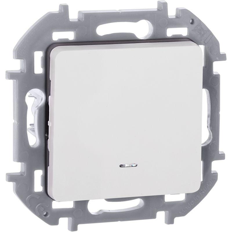 Переключатель одноклавишный с подсветкой/индикацией Legrand Inspiria для скрытого монтажа,цвет "Белый", номинальный ток 10 А, напряжение ~250В. Предназначен для установки в электрических сетях жилых и общественных зданий и используется для управления приборами освещения, вентиляции и т.д. Используется для управления нагрузкой с одного, двух или более мест (совместно с промежуточными выключателями). Оснащен светодиодной лампой для подсветки или индикации. Особенности изделия: - Компактный механизм с глубиной всего 20 мм. комфортно размещается в различных монтажных коробках. - Материал клавиш - глянцевый пластик АБС, стоек к выгоранию и загрязнениям. - Все токоведущие части выключателя имеют защиту от случайного прикосновения. - Безвинтовые зажимы для присоединения проводов обеспечивают быстрое подключение и отключение, гарантируют надежное и долговечное соеднинение и не требуют обслуживания. - Удобные широкие толкатели облегчают работу по демонтажу провода. - Улучшенная эргономика снижает вероятность искрения при коммутации светодиодов. - Ход клавиши короткий, не громкий. - Универсальная LED-лампа белого цвета с низким энергопотреблением 0.125мА и возможностью замены - Благодаря свободной схеме подключения, лампа подсветки либо облегчает ориентирование в темноте, либо информирует о включении нагрузки. - Клавиша оборудована линзой для заметного светового сигнала подсветки или индикации.