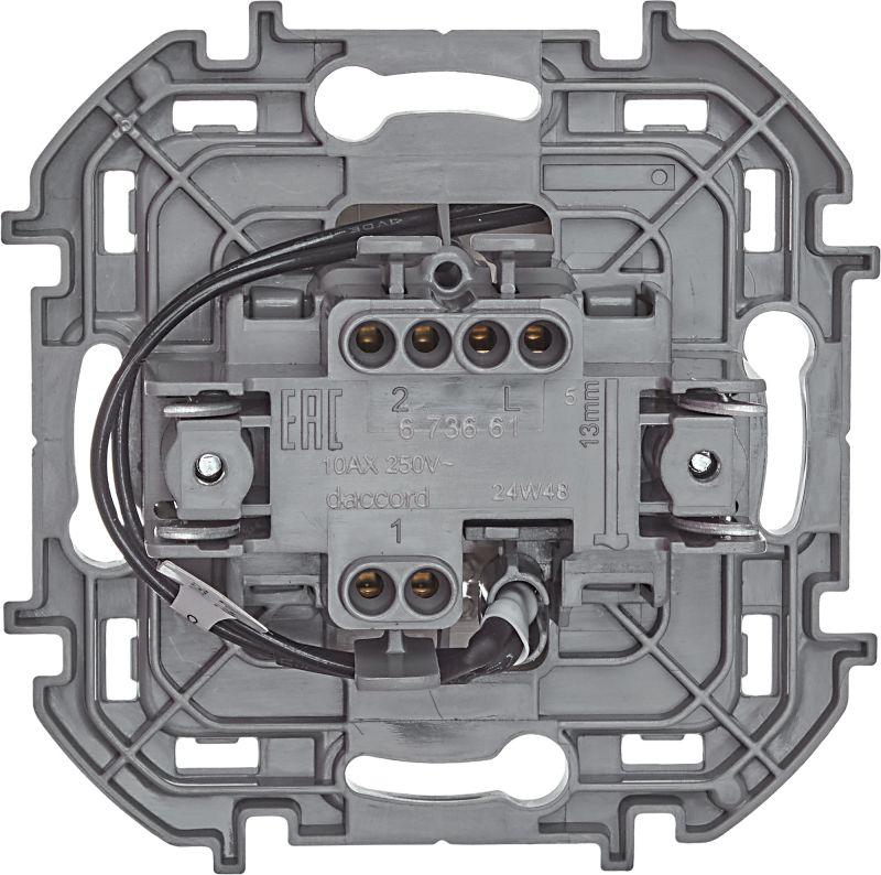 Переключатель одноклавишный с подсветкой/индикацией Legrand Inspiria для скрытого монтажа,цвет "Слоновая кость", номинальный ток 10 А, напряжение ~250В. Предназначен для установки в электрических сетях жилых и общественных зданий и используется для управления приборами освещения, вентиляции и т.д. Используется для управления нагрузкой с одного, двух или более мест (совместно с промежуточными выключателями). Оснащен светодиодной лампой для подсветки или индикации. Особенности изделия: - Компактный механизм с глубиной всего 20 мм. комфортно размещается в различных монтажных коробках. - Материал клавиш - глянцевый пластик АБС, стоек к выгоранию и загрязнениям. - Все токоведущие части выключателя имеют защиту от случайного прикосновения. - Безвинтовые зажимы для присоединения проводов обеспечивают быстрое подключение и отключение, гарантируют надежное и долговечное соеднинение и не требуют обслуживания. - Удобные широкие толкатели облегчают работу по демонтажу провода. - Улучшенная эргономика снижает вероятность искрения при коммутации светодиодов. - Ход клавиши короткий, не громкий. - Универсальная LED-лампа белого цвета с низким энергопотреблением 0.125мА и возможностью замены - Благодаря свободной схеме подключения, лампа подсветки либо облегчает ориентирование в темноте, либо информирует о включении нагрузки. - Клавиша оборудована линзой для заметного светового сигнала подсветки или индикации.