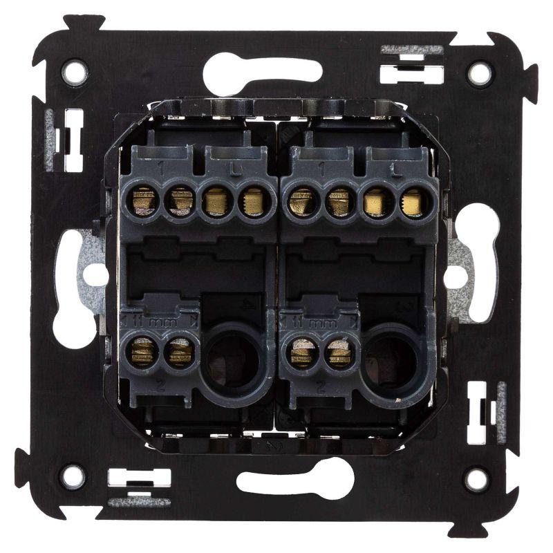 Переключатель двухклавишный в стену серии "Avanti". Предназначен для монтажа в подрозеточные коробки (код 59301). Используется для включения/выключения освещения из двух мест. Диаметр отверстий для ввода кабелей – 3 мм (по 2 отверстия на одну клемму); винтовые зажимы; шаблон для зачистки кабеля – 11 мм. Номинальный ток – 16 A. Номинальное напряжение – 230 В. Для оснащения подсветкой необходимо заказать 2 лампы. Фиксация в подрозеточную коробку производится при помощи саморезов; 2 модуля. Цвет: "Черный матовый". Производитель оставляет за собой право вносить во внешний вид изделия изменения, которые не влияют на его функционал, безопасность и надежность.