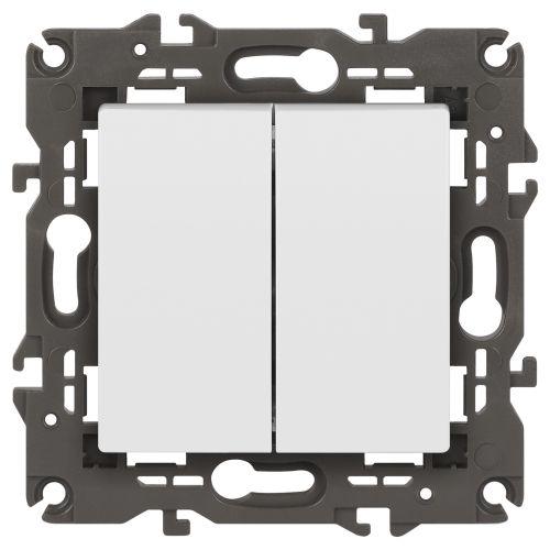 Выключатель 2-клавишный проходной Эра Elegance белый 14-1106-01. Оснащён автоматическими клеммами для надёжной фиксации жил кабеля в механизме. Рамки приобретаются отдельно. Рамки Эра Elegance ПЛАСТИК: 1 пост 14-5001-хх, 2 поста 14-5002-хх, 3 поста 14-5003-хх, 4 поста 14-5004-хх, 5 постов 14-5005-хх; СТЕКЛО: 1 пост 14-5101-хх, 2 поста 14-5102-хх, 3 поста 14-5103-хх, 4 поста 14-5104-хх; МЕТАЛЛ: 1 пост 14-5201-хх, 2 поста 14-5202-хх, 3 поста 14-5203-хх, 4 поста 14-5204-хх; ДЕРЕВО: 1 пост 14-5301-хх, 2 поста 14-5302-хх, 3 поста 14-5303-хх, 4 поста 14-5304-хх (хх - код цвета: 00-прозрачный, 01-белый, белёный дуб, 02-слоновая кость, 03-алюминий, 04-шампань, 05-чёрный, чёрное дерево, 07-ясень, 09-дуб, 10-венге, 11-клён, 14-медь, 21-жёлтый, 22-оранжевый, 23-красный, 25-бордо, 26-лайм, 27-зелёный, 28-голубой, 29-синий, 30-розовый, 31-мокко, 32-серый, 41-сталь, 42-титан).