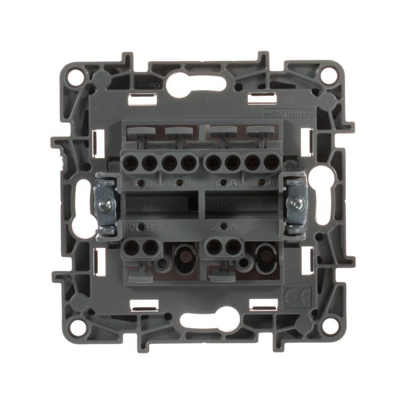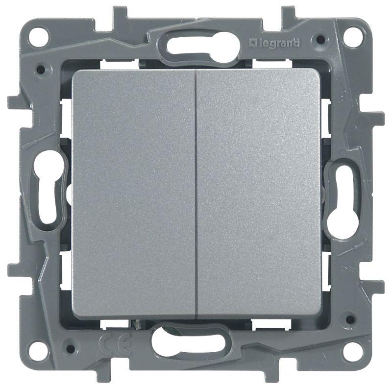 Переключатель двухклавишный Legrand Etika для скрытого монтажа, номинальный ток 10 А, цвет алюминий. Предназначен для управления двумя нагрузками с одного или с двух мест. Особенности: - Матовый ,материал клавиши AБС пластик- стоек к выгоранию и загрязнениям. - Ход короткий, не громкий. - Все токоведущие части выключателя имеют защиту от случайного прикосновения. - Безвинтовые зажимы для присоединения проводов не требуют обслуживания. Особенности серии Etika: - Корпус механизма- высококачественный поликарбонат, не проводит электрический ток, не поддерживает горение. - Специальный профиль внешнего контура механизма обеспечивает простоту и безошибочность многопостового монтажа. - Острые крепёжные лапки с широким углом раскрытия, обеспечивают надёжную фиксацию в монтажной коробке.