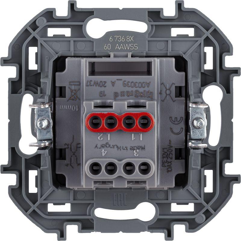 Переключатель промежуточный одноклавишный Legrand Inspiria для скрытого монтажа, цвет "Белый", номинальный ток 10 А, напряжение ~250В. Предназначен для установки в электрических сетях жилых и общественных зданий и используется для управления приборами освещения, вентиляции и т.д. Используется для управления нагрузкой с трех или более мест. Особенности изделия: - Компактный механизм с глубиной всего 20 мм. комфортно размещается в различных монтажных коробках. - Материал клавиши - глянцевый пластик АБС, стоек к выгоранию и загрязнениям. - Все токоведущие части выключателя имеют защиту от случайного прикосновения. - Для подсоединения проводов используются винтовые зажимы. - Улучшенная эргономика снижает вероятность искрения при коммутации светодиодов. - Ход клавиши короткий, не громкий.